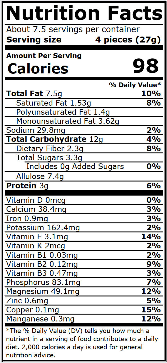 Almonds*, Allulose*, Dates*, Cocoa Paste* (unprocessed 100% chocolate), Kale*, Stevia leaf,* Iodized Salt (without anti-caking agents), Virgin coconut oil*.